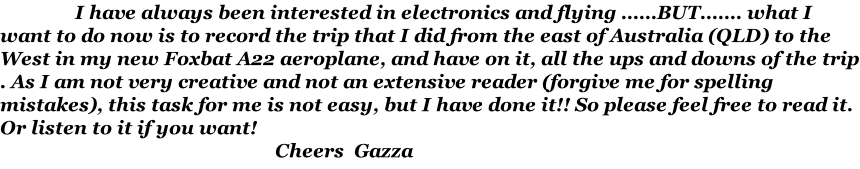 The start had been planned for first light Friday 22nd February although I did have a few dramas the night before as I didn’t tell the place where I was staying that I would be in for that night and so I had to find refuge with Noel and Steve at their boarding place. That worked out well as we all got up together quite early. It was a restless sleep for me as I was a bit worried about the next day, not because of the accommodation. We arrived at Redcliffe airstrip and we did the pre take off checks, fuel, oil, etc and then departed to the first place called Watts Bridge. It is a pity that I didn’t set the date in the camera (1 year too early) also date and time in the G.P.S. I was using to keep a track of my movements as then I could’ve recalled any data and time but the other data recorded was correct like ground speed, direction, height above sea level, etc.